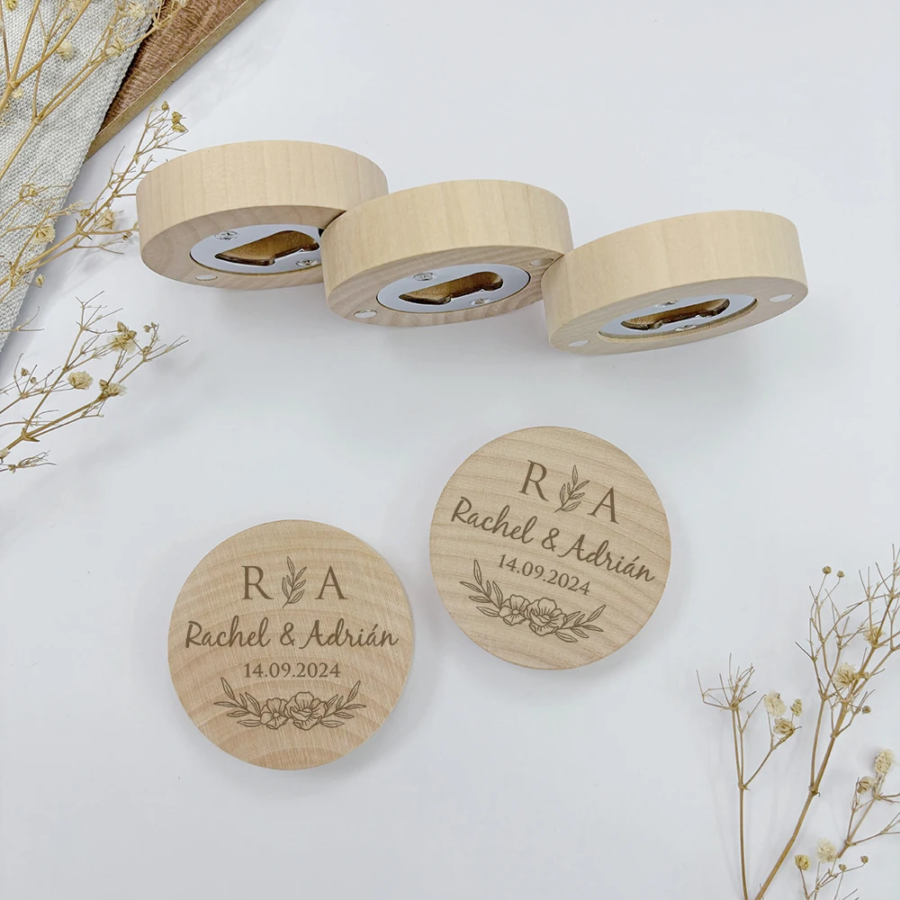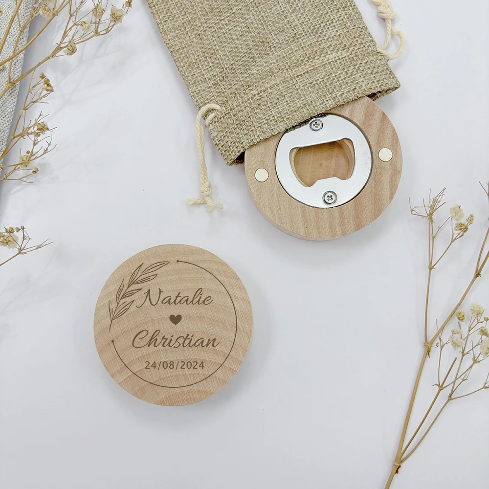 Custom Wedding Magnet Souvenirs Personalized Wedding Gifts for Guests Wooden Fridge Magnet Bottle Opener with Burlap Bag